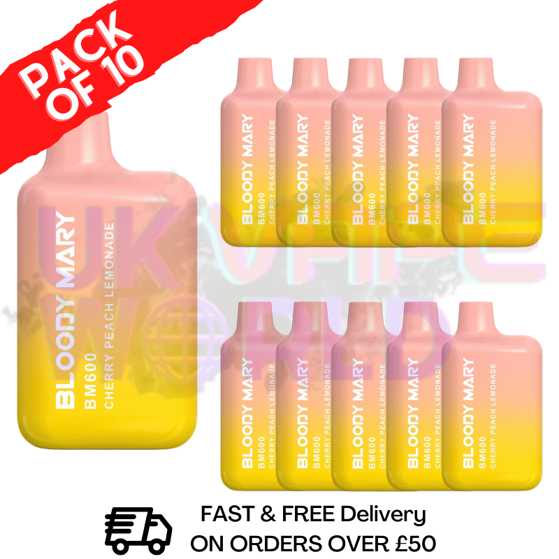 Cherry Peach Lemonade - Bloody Mary 600Puff Disposable Pod Kit blend of juicy cherries, saccharine perky peach, and zesty citric lemons specially crafted for a smooth and refreshing flavour