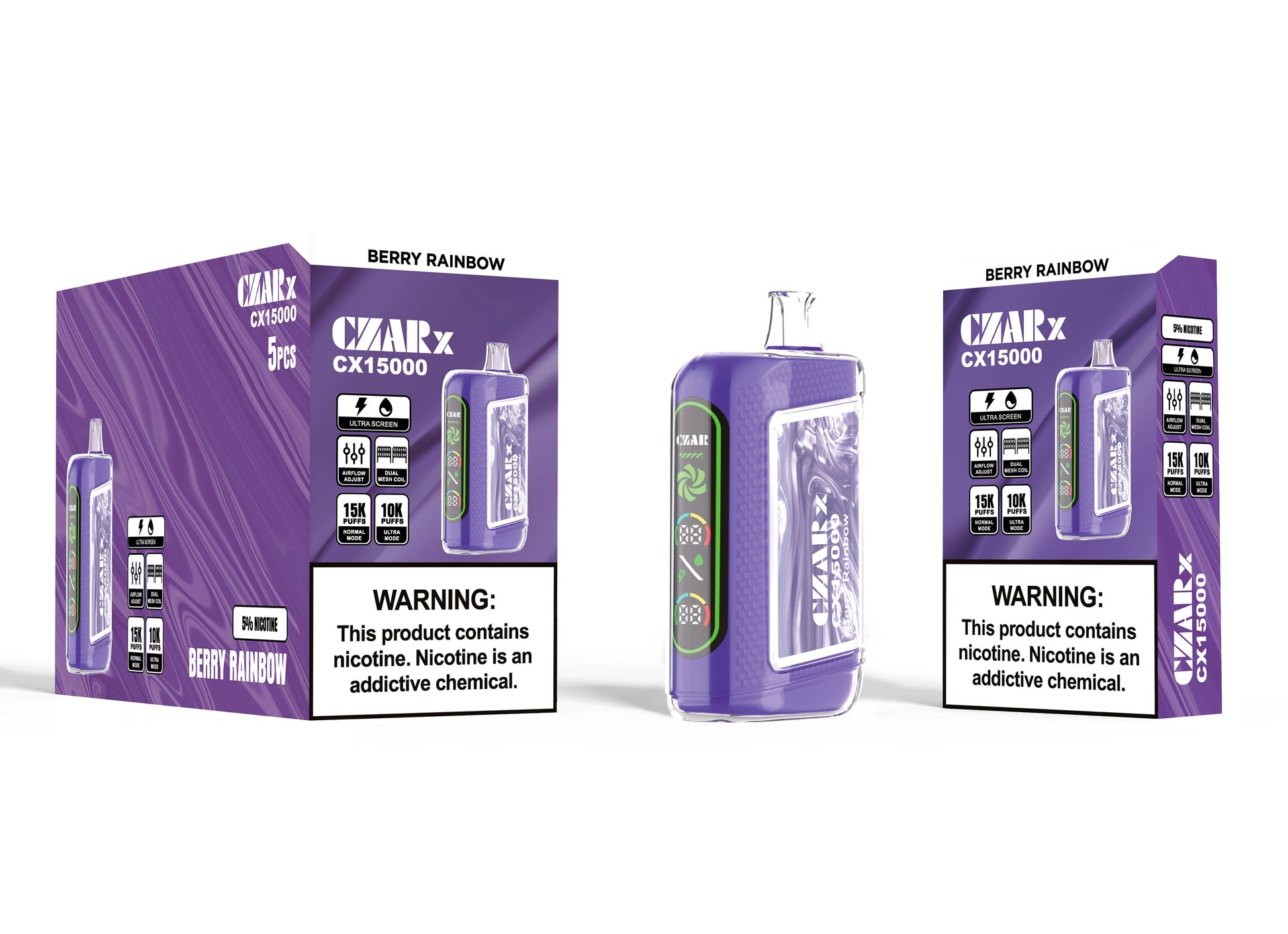 Compact and Portable: The sleek and compact design of the CZAR CX 15000 makes it easy to carry in your pocket or purse, allowing you to enjoy vaping on the go wherever you are.The CZAR Disposable Vape comes with an ultra screen providing a clear view of your e-liquid levels and battery information.