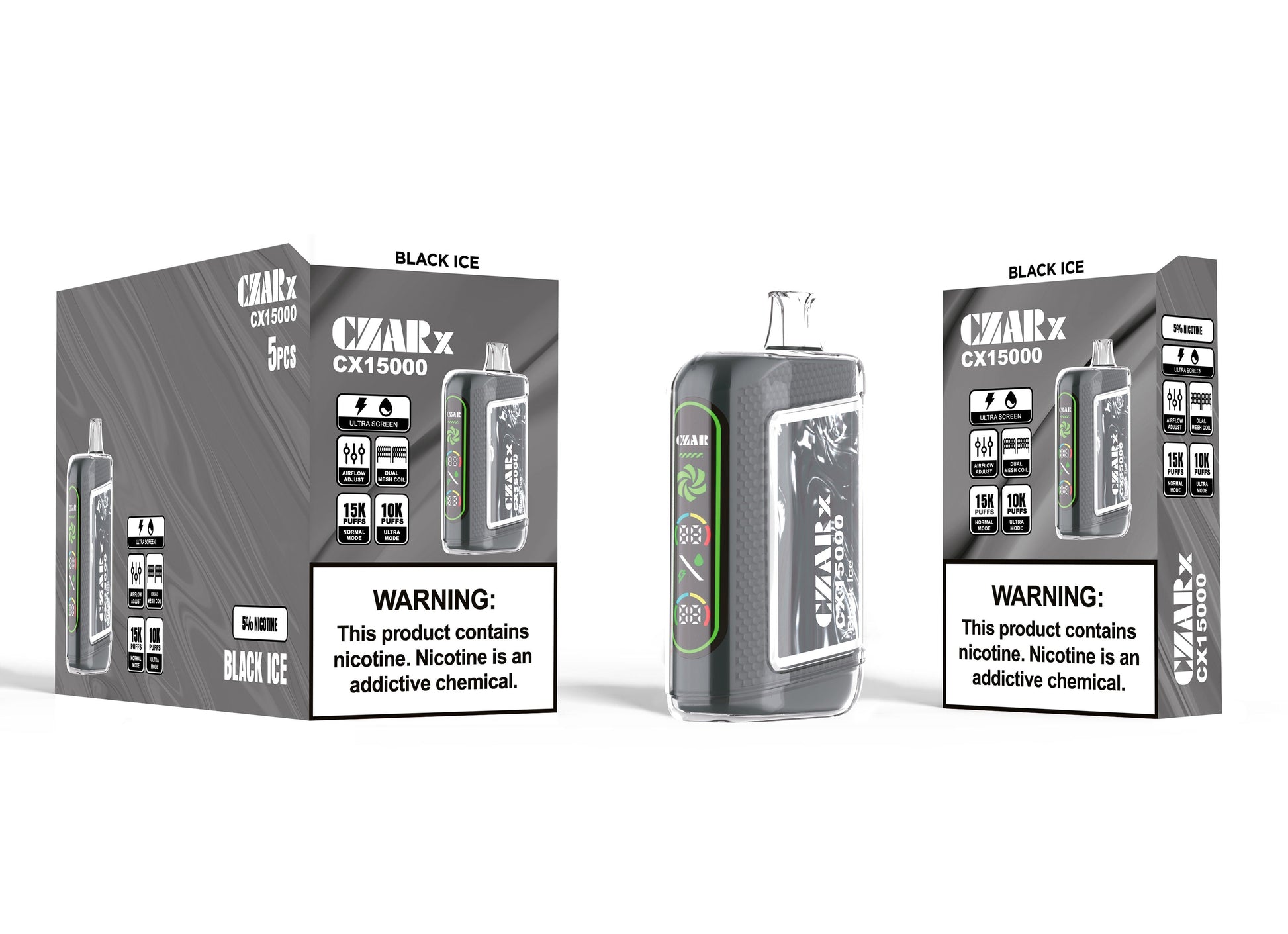 Compact and Portable: The sleek and compact design of the CZAR CX 15000 makes it easy to carry in your pocket or purse, allowing you to enjoy vaping on the go wherever you are.The CZAR Disposable Vape comes with an ultra screen providing a clear view of your e-liquid levels and battery information.