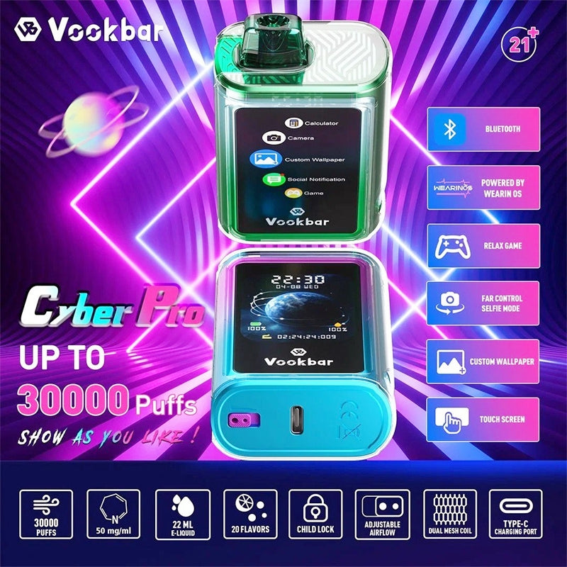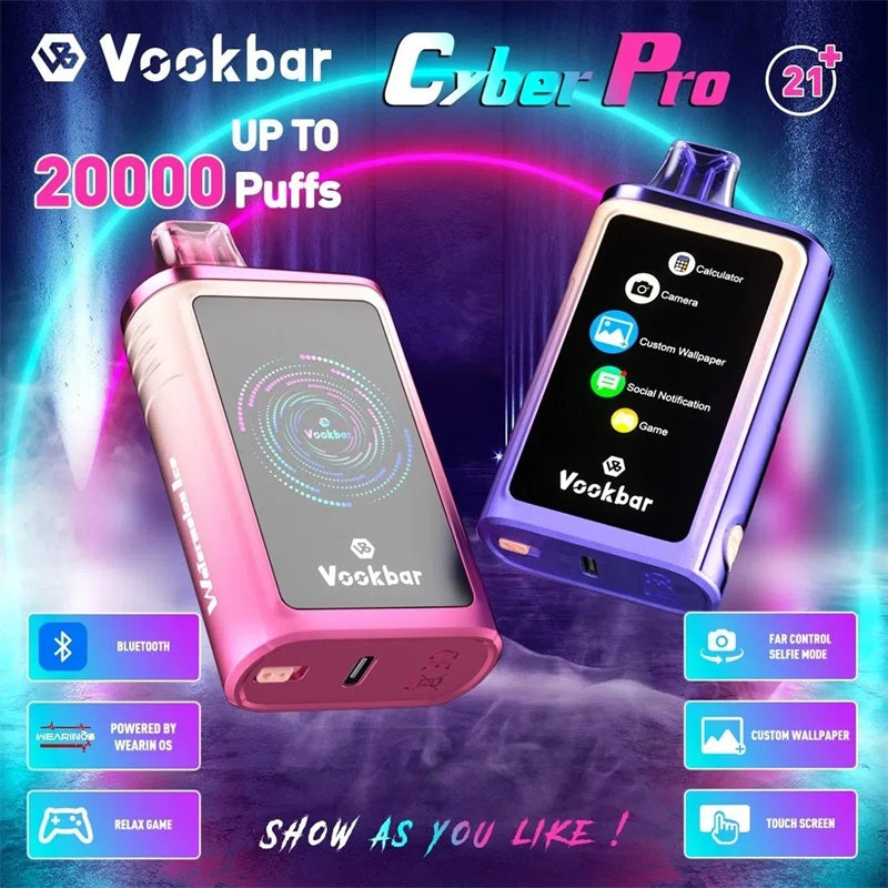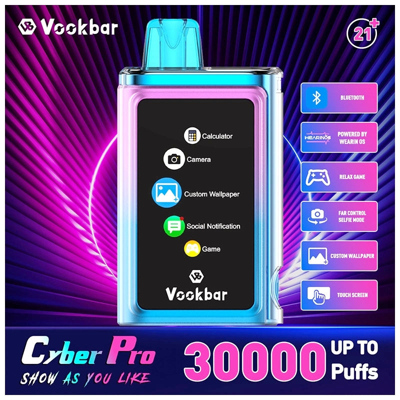 Vookbar Cyber Pro 30000 Disposable Vape is an APP-controlled smart vape with a Bluetooth connection. Equipped with 22ml vape juice and a robust battery. it can satisfy up to 30000 puffs at most. With the WEARINOS APP installed on your phone. you can unlock the versatility of Vookbar Cyber Pro. It can be used as a convenient calculator and receive messages from your phone. Plus. if you feel like a selfie. you can control your phone remotely with this vape. Other functions like games and motion tracking are just waiting for you to enjoy with this Vookbar Cyber Pro.