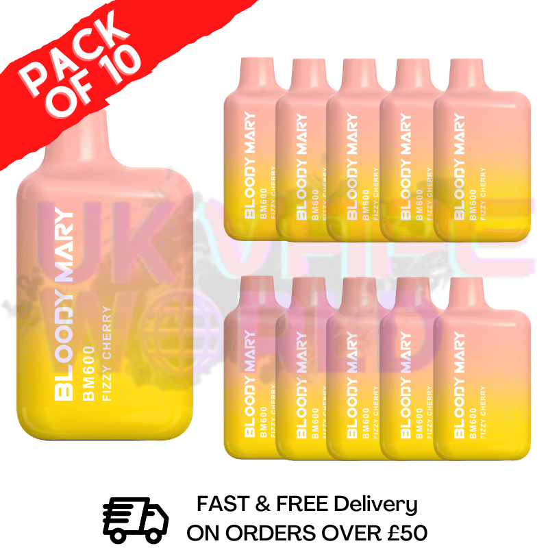Fizzy Cherry - Bloody Mary 600Puff Disposable Pack Of 10 gives you a unique mix of cherry flavors, making your taste buds dance with excitement. Enjoy the cherry soda sensation with each puff!!