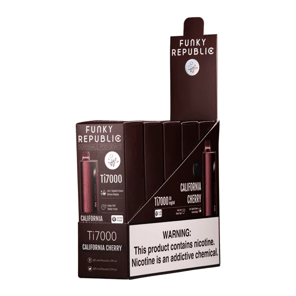 Revolutionize your vaping routine with the effortless design of the California Cherry Funky Lands Ti7000. This rechargeable disposable vape eliminates any need for complicated setups or messy refills while delivering up to 7,000 puffs of cherry-filled delight. Its sleek, pocket-friendly shape ensures it’s easy to carry wherever your day takes you, while the rechargeable feature keeps you puffing far longer than traditional disposables. When it’s time to say goodbye, simply dispose of it responsibly and experience worry-free vaping at its finest. Convenience, taste, and a touch of playful indulgence combine in the perfect package.