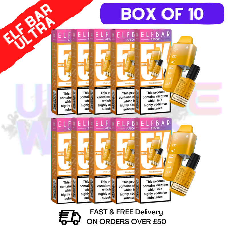 Pink Lemonade ELF BAR AF 5000 5K Vape Puff 5000Puff Bars is a summery concoction blending the sweetness of ripe strawberries with the tartness of lemonade, resulting in a pink-hued, fruity, and thirst-quenching vaping experience. A perfect addition to the ELF 5K Range!