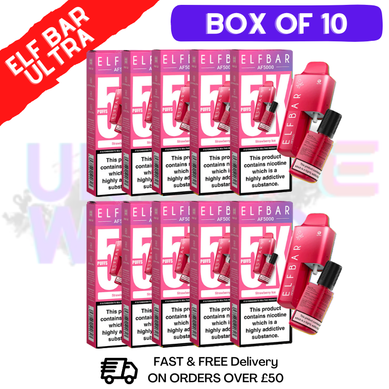 Strawberry ICE ELF BAR AF 5000 5K Vape Puff 5000Puff Bars is a irresistible sweetness of ripe strawberries, complemented by a cooling menthol undertone, creating a well-balanced and frosty strawberry vape. A perfect addition to the ELF 5K Range!